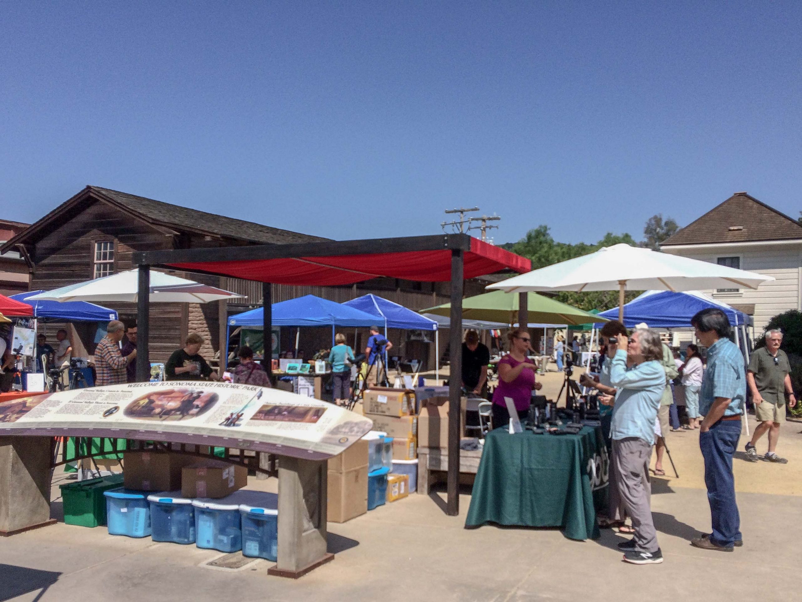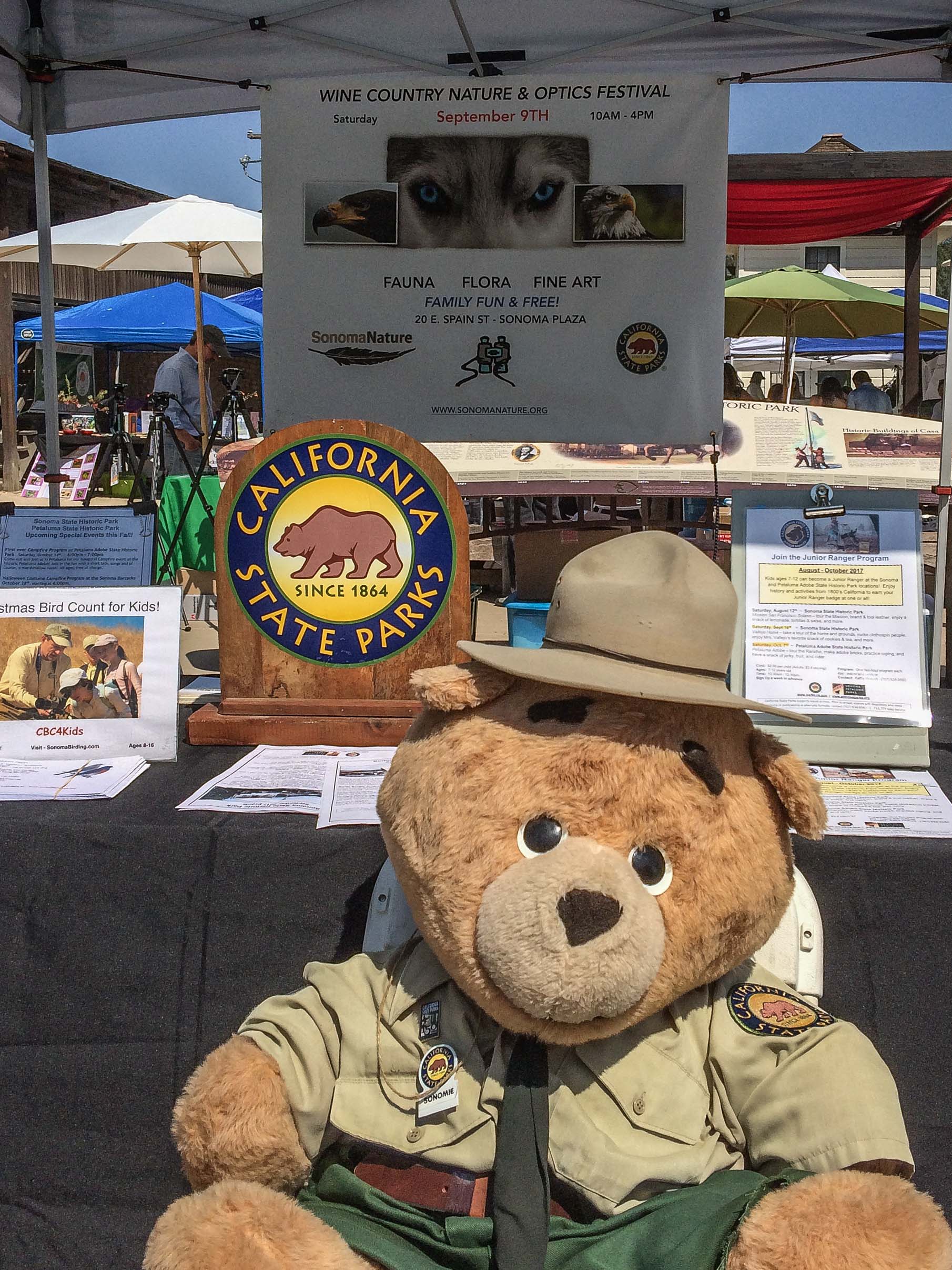 Sonoma State Historical Park again hosted the annual Wine Country Nature and Optics Festival with Sonoma Birding on September 9 in the Casa Grande courtyard. Locals and visitors were welcomed by Sonomie Bear and perused the displays including binoculars and telescopes. informational exhibits from environmental organizations and other state parks, and live birds under the care of local rehab centers.
