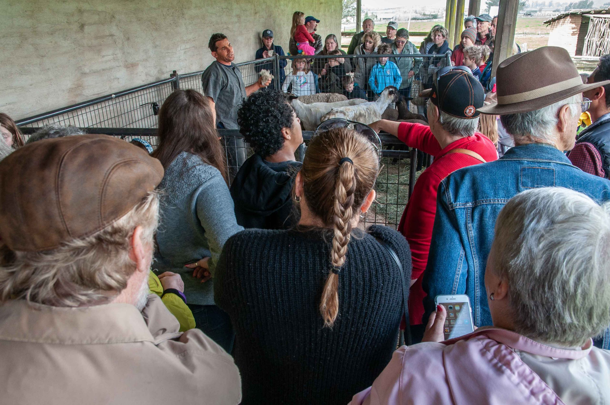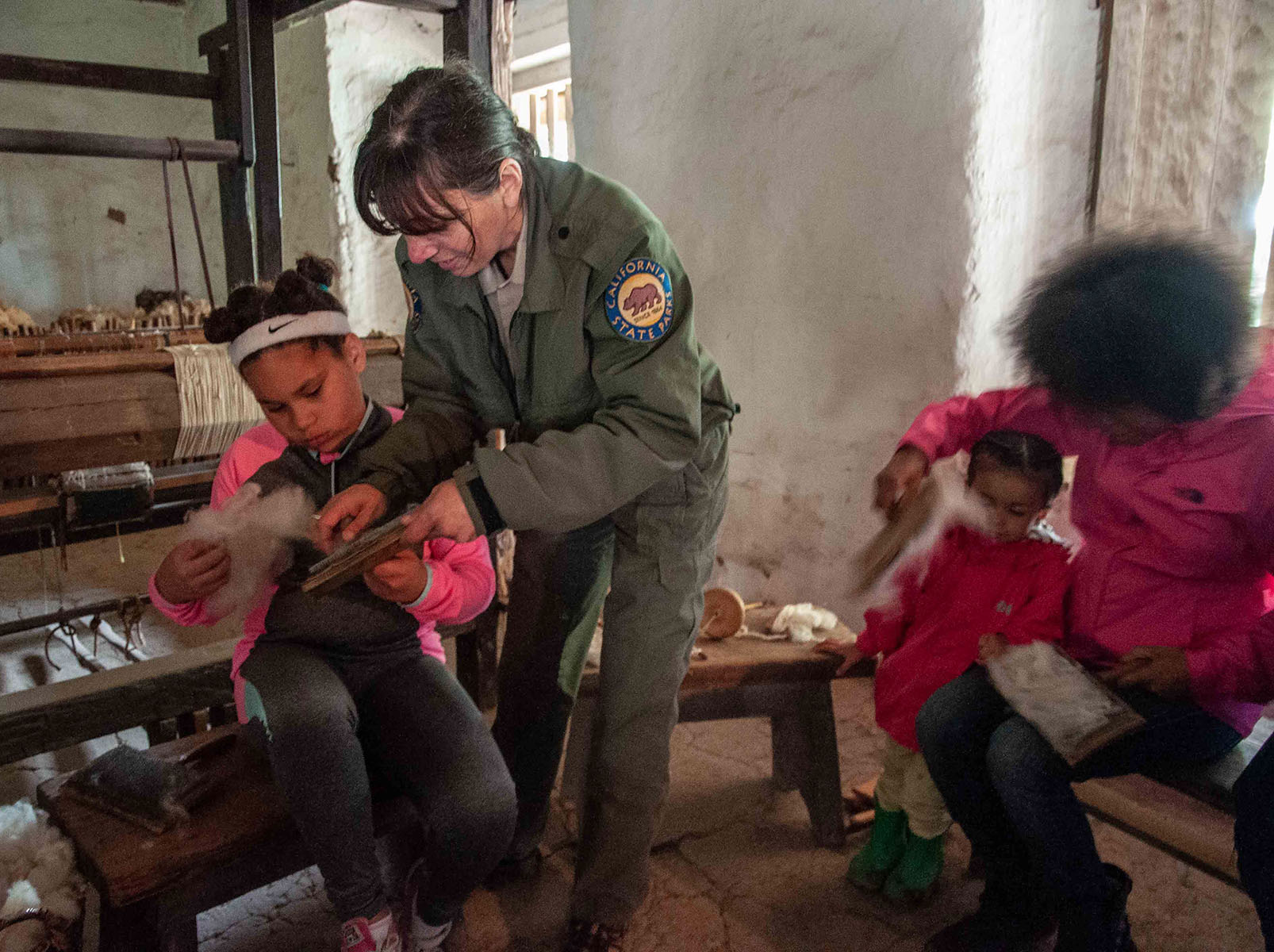 The annual Sheep Shearing event was held at the Petaluma Adobe on Saturday, April 7. An “atmospheric river” passed over on Friday dumping lots of rain, with a forecast of more to come on Saturday. But that rain never came! Saturday was fair and families flocked (pun intended) to the Adobe, filling the parking lot at an early hour. They watched John Sanchez shear sheep and answer questions about this first step on the path to your wool sweater. One effect of the earlier rain was that the sheep he had intended to shear had gotten wet so he switched to another flock that included some lambs. They were brought along to be with mamma and the children loved that. We even had one goat in attendance. Doug Johnson, our new park restoration specialist, brought Bill, available for petting. With the anticipated rain, arrangements had been made to move the wool crafts stations indoors. The carding, drop spindle, spinning and weaving demonstrators did their best but the spaces were cramped and dark and drew a smaller attendance than in past years. Liliana Lavezzo, our new Parks Interpreter Specialist, had a chance to demonstrate her new skills in carding wool and using the drop spindle.