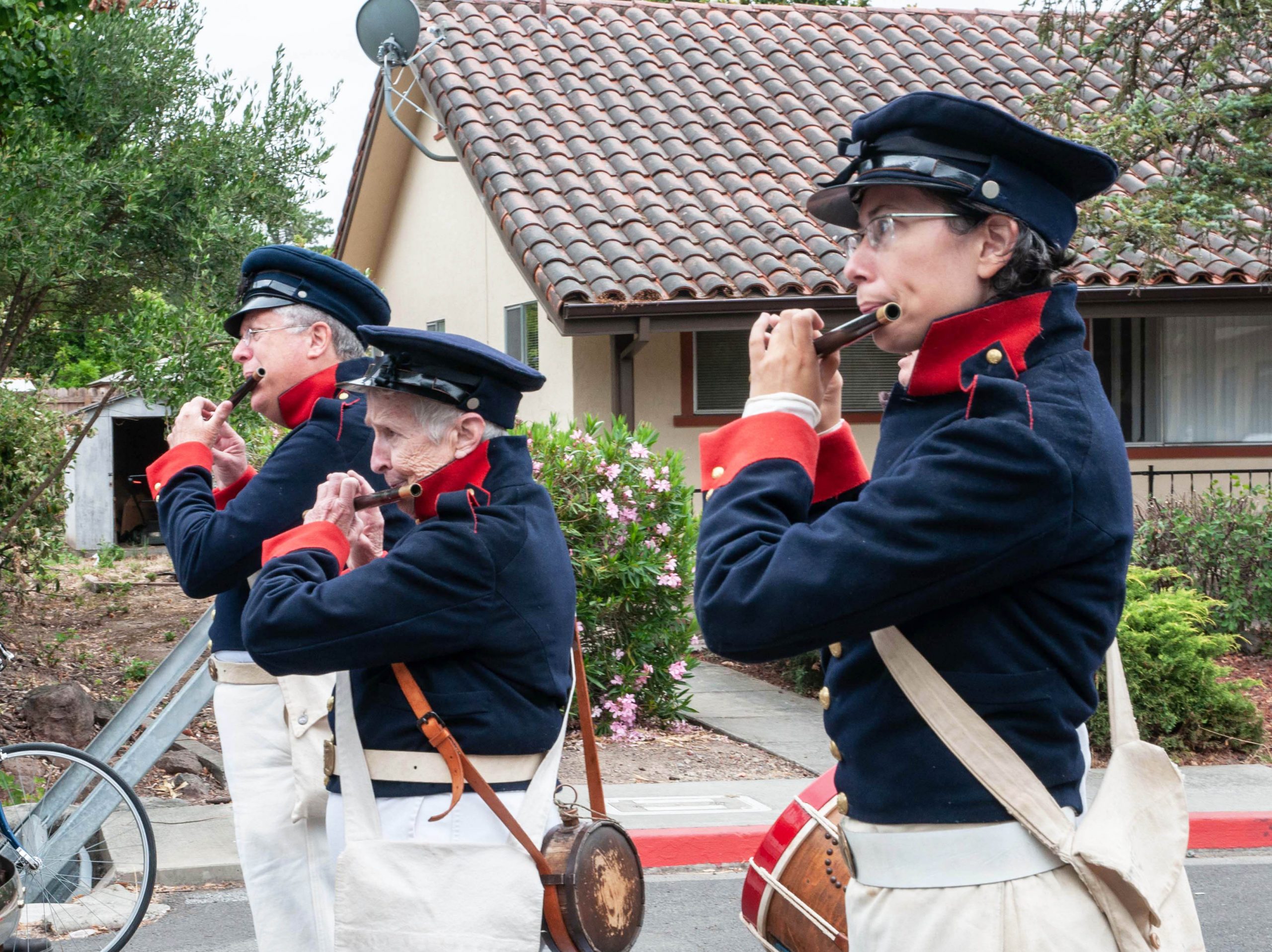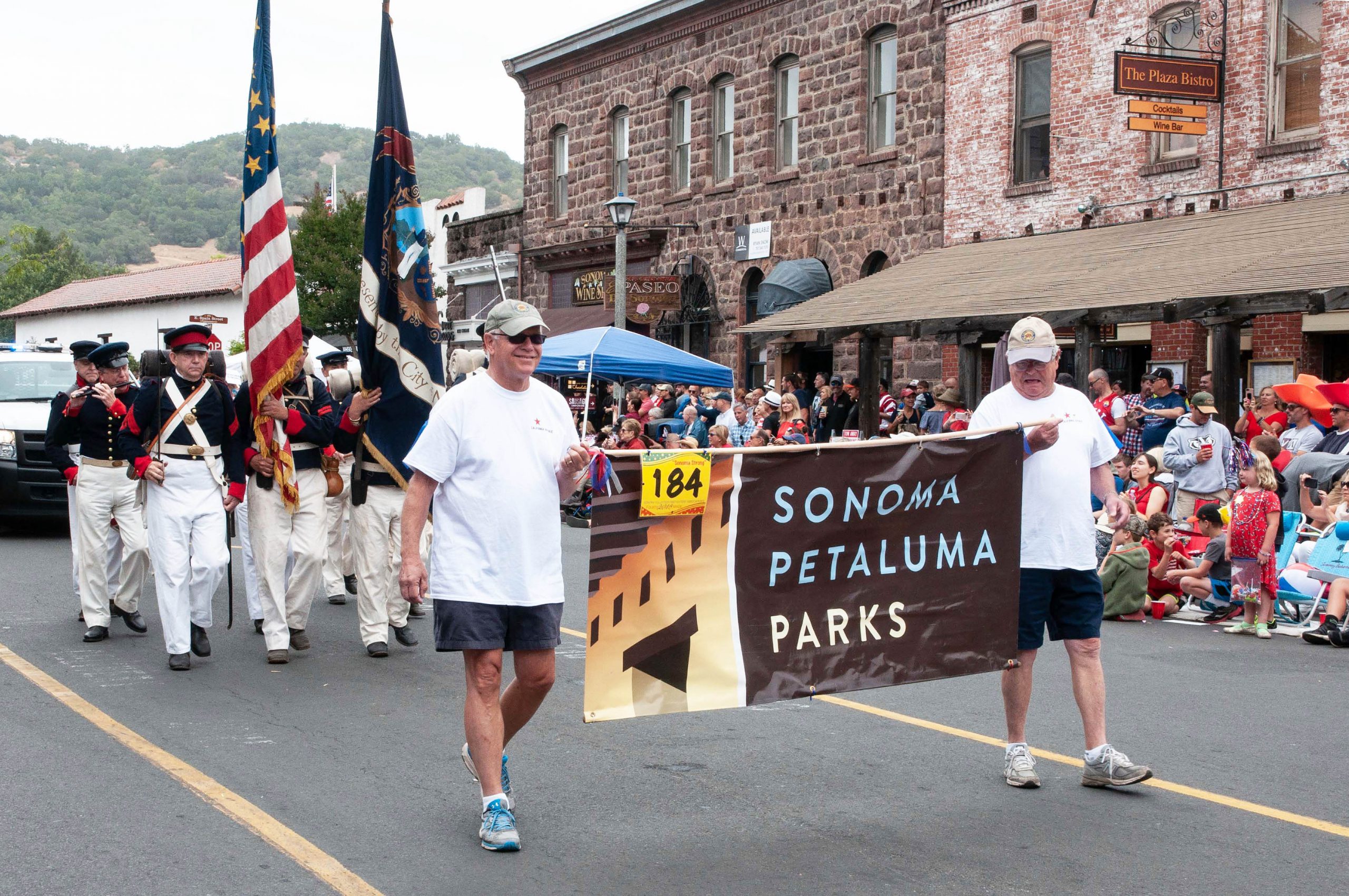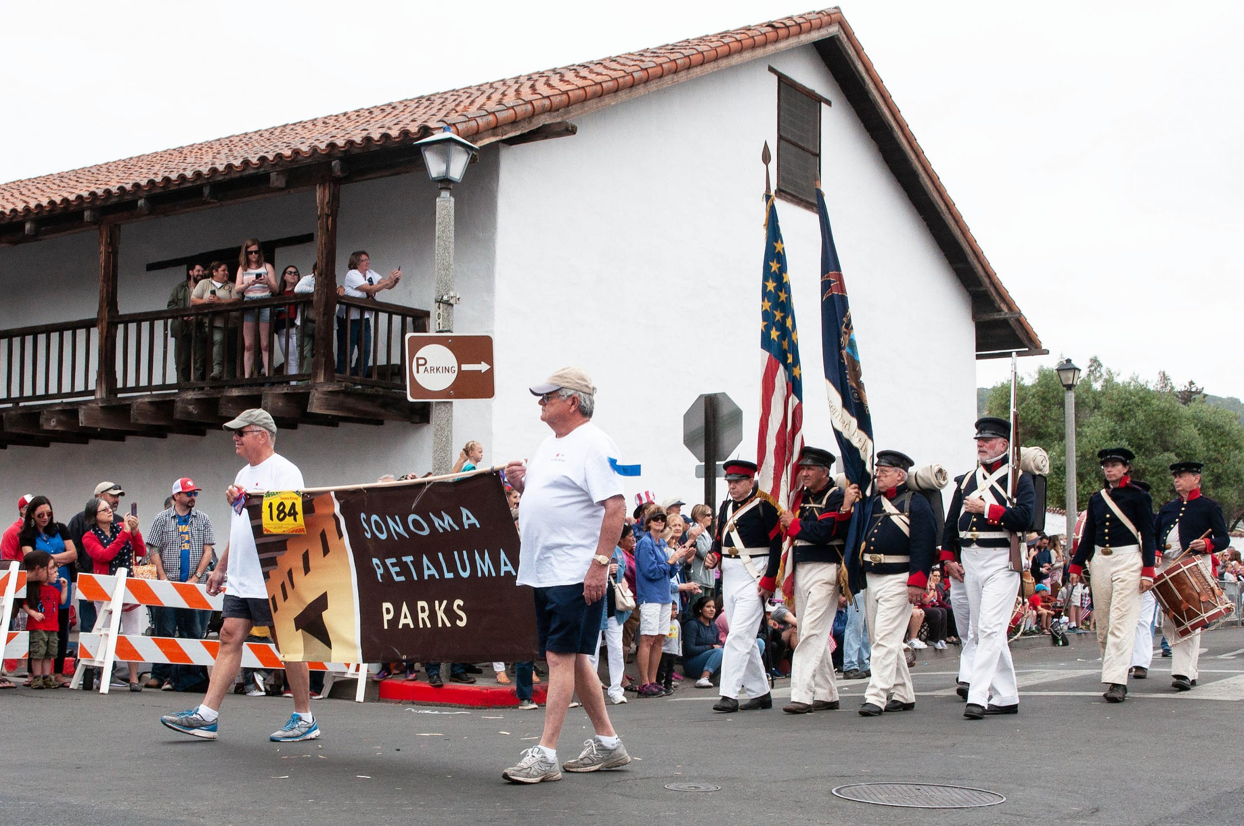 Sonoma State Historic Park and SPParks honored our park staff for their heroic effort making sure park structures and the artifacts they contain were kept safe during the October fires. Park staff Carol Dodge, Kathy Wolcott, Dana Bravo and Jason Hart waved to the crowds from our float and SPParks members Yvonne Bowers, Anne Cox, Frances Weiner and Dave Brummett were an honor guard marching alongside. Jim Danaher and Mike Cox carried the SPParks banner in the lead, followed by a fife and drum honor guard of members of the New York Legion. Rob Pickett and Dave Duplantier (with sidekick Sonomie) provided transportation while Bob Alwitt ran around taking these photos.