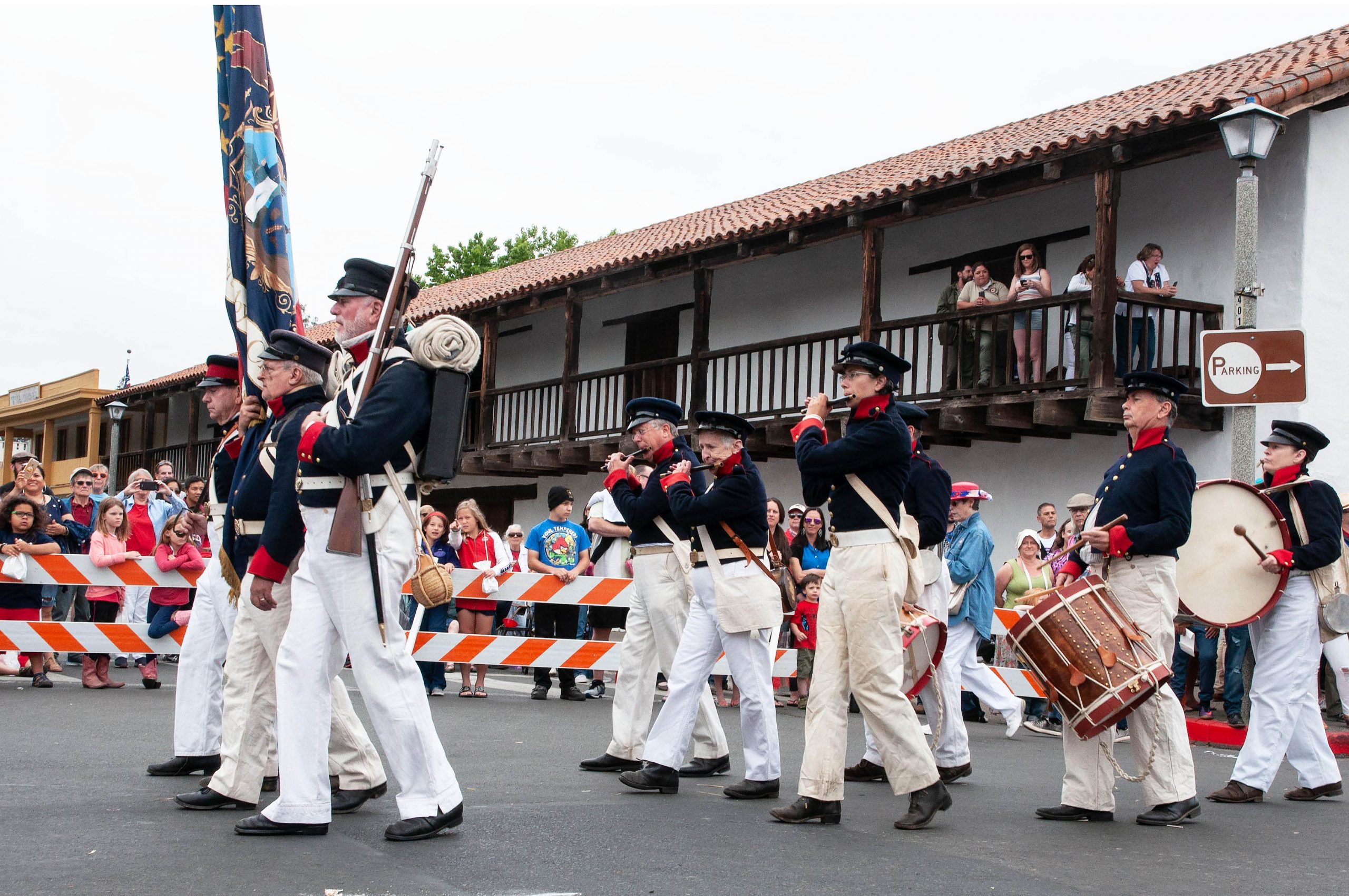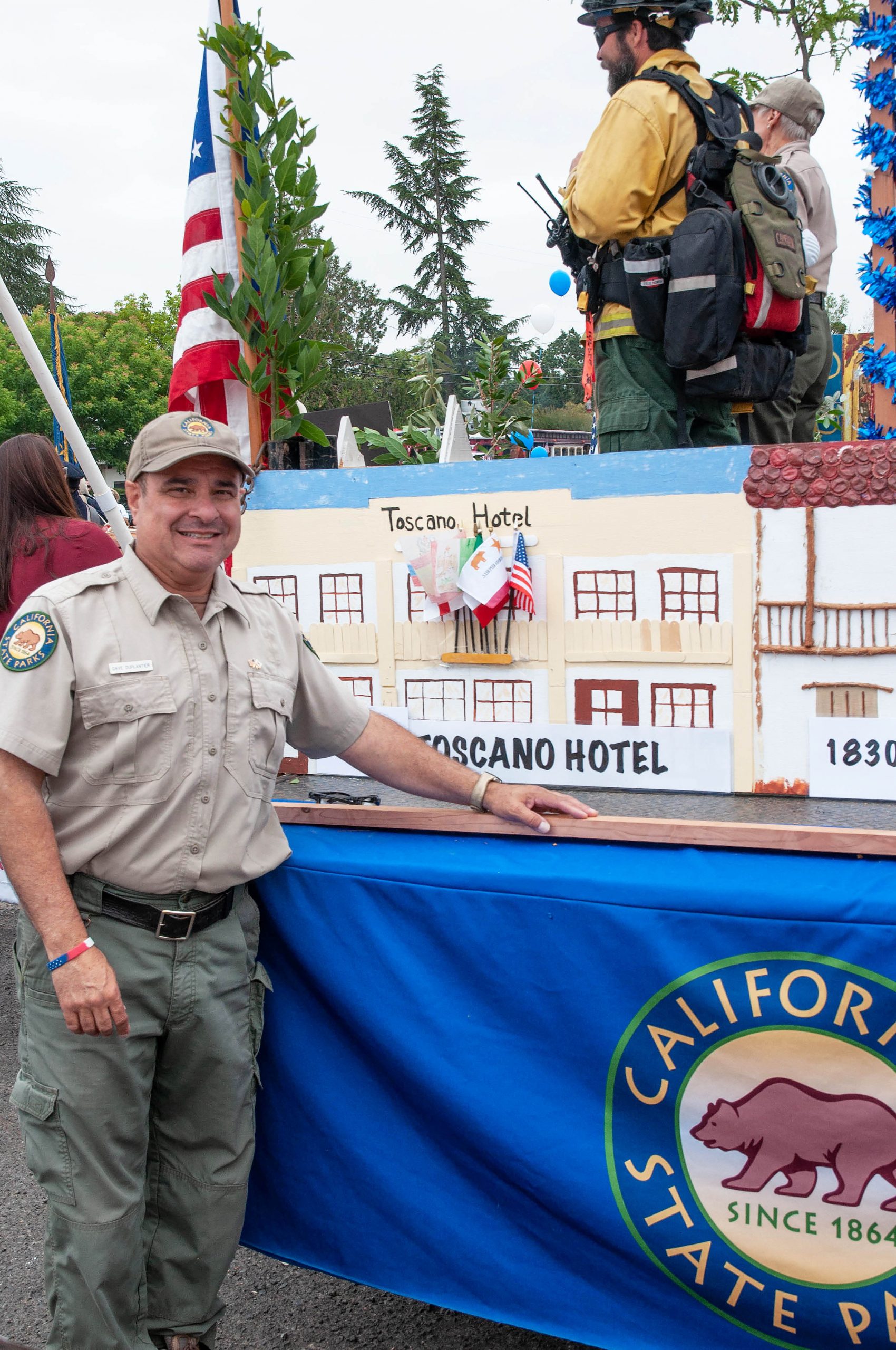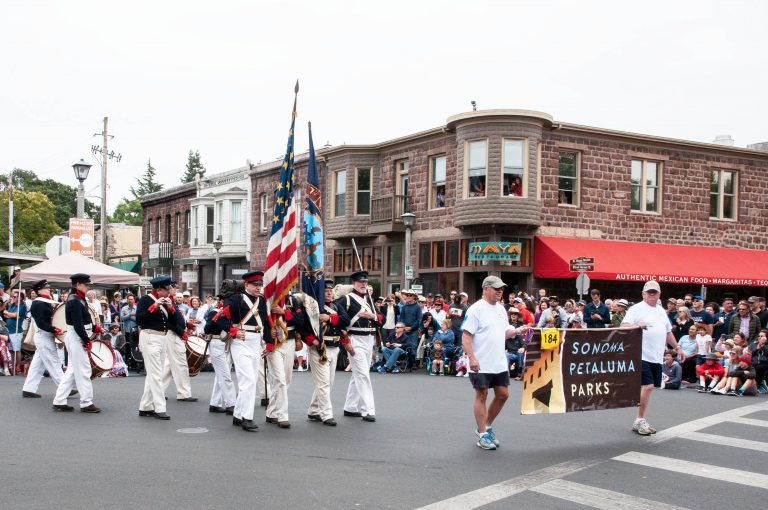 Sonoma State Historic Park and SPParks honored our park staff for their heroic effort making sure park structures and the artifacts they contain were kept safe during the October fires. Park staff Carol Dodge, Kathy Wolcott, Dana Bravo and Jason Hart waved to the crowds from our float and SPParks members Yvonne Bowers, Anne Cox, Frances Weiner and Dave Brummett were an honor guard marching alongside. Jim Danaher and Mike Cox carried the SPParks banner in the lead, followed by a fife and drum honor guard of members of the New York Legion. Rob Pickett and Dave Duplantier (with sidekick Sonomie) provided transportation while Bob Alwitt ran around taking these photos.