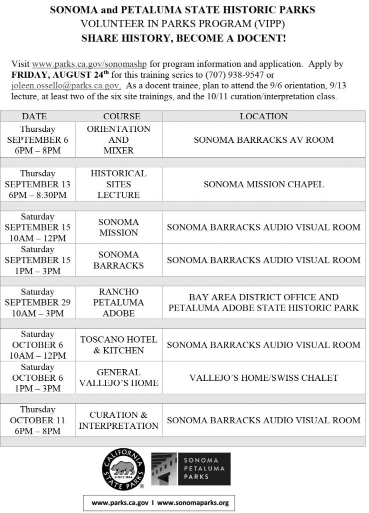 Training for new docents, docents who want to serve at a new venue, and those who just want to refresh their knowledge will be held in September and October. There will be eight sessions covering all venues and interpretive skills. Tell your friends and plan to attend some or all of the lectures. See the flyer for details.