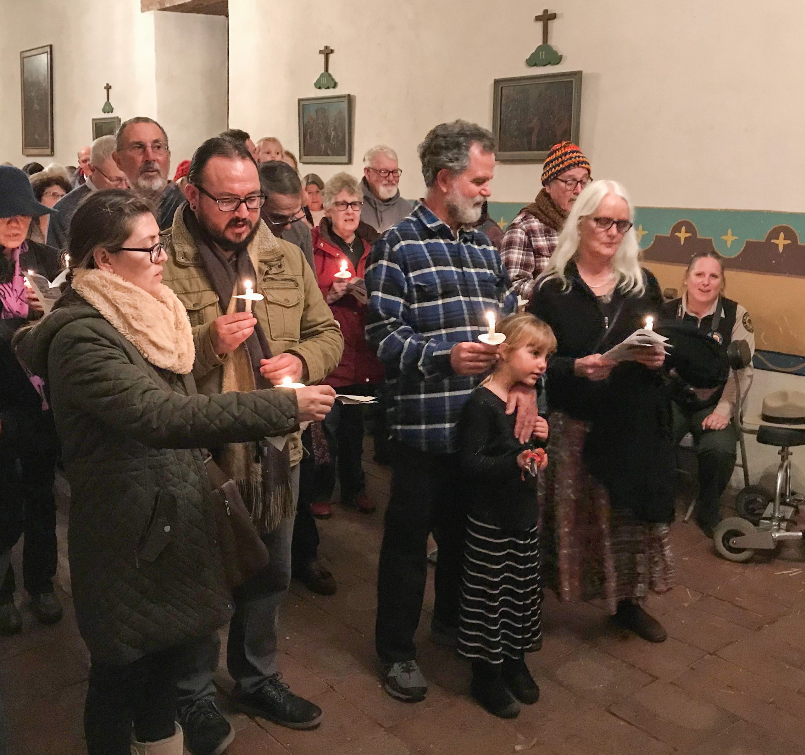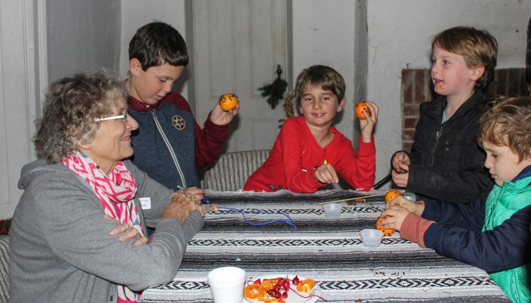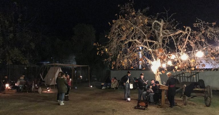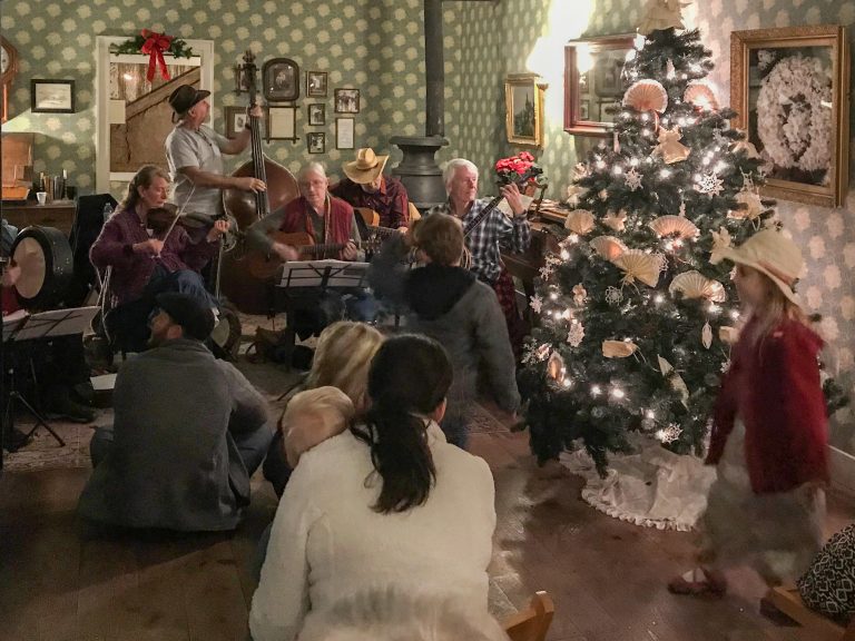 On December 8, the Sonoma SHP venues were filled with holiday revelers taking part in activities they have come to love through the years. Participants attended three sessions at the Mission, joining the Sonoma Valley HS Choir in singing carols under the watchful gazes of Mary (Sarah Ross) and Joseph (Dino Estella). Sheriff Alex Coburn preserved order at the Blue Wing Inn (though this hardly seemed necessary at the table where kids were making clove oranges). Crafts also were pursued in the A/V room at the Barracks, while in the courtyard the 20th Maine Company G bivouacked and greeted visitors. The Toscano Hotel once again echoed with the merry sounds of the Pickle Creek Band. A memorable night on the town.