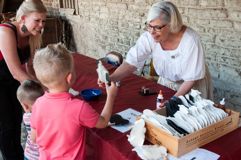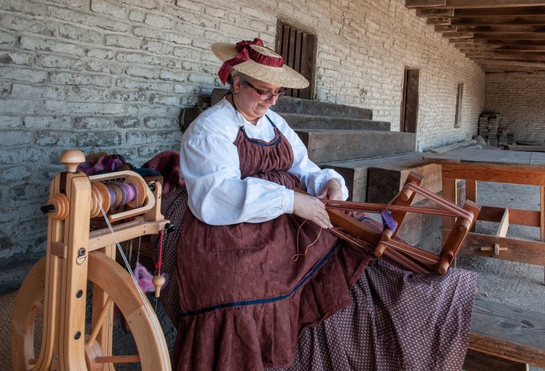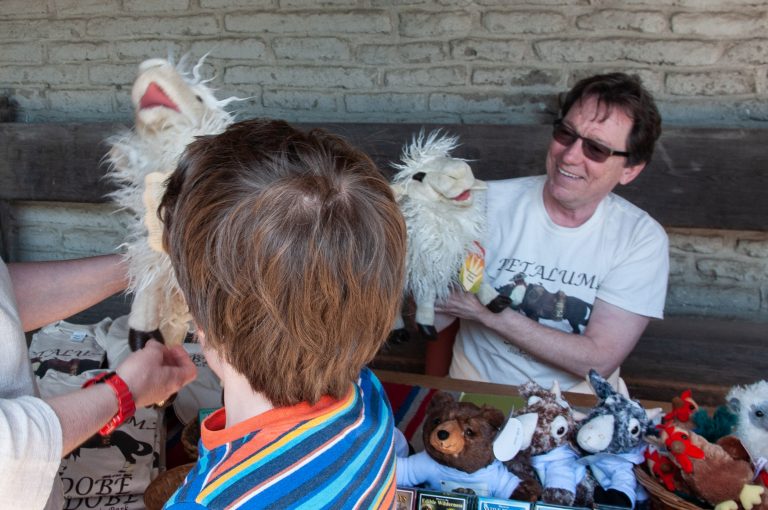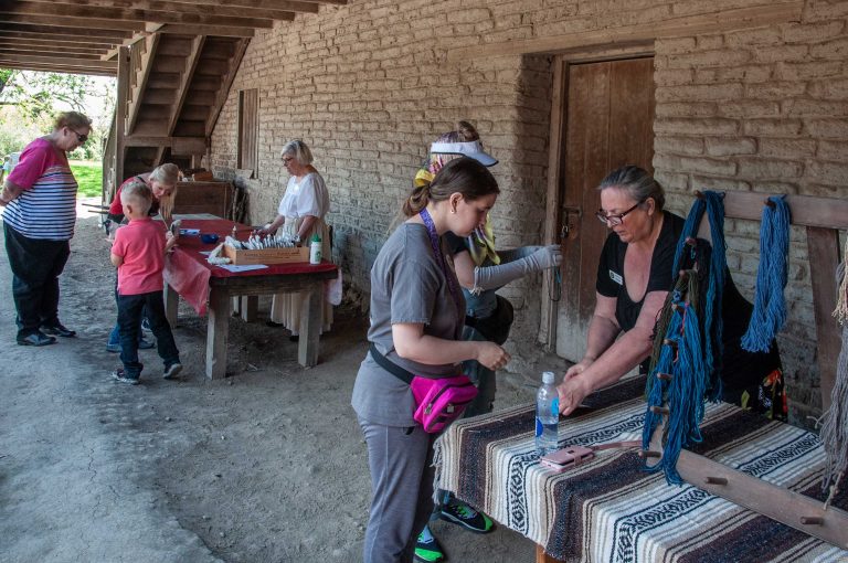 Crafts demonstrators were arrayed around the courtyard . You could try your hand at spinning carded wool into yarn, do wool embroidery, observe the use of a hand inkle loom, a very old design used to make narrow items like belts and straps, and make your own wooly sheep. Patrick Kearney, manager of the Sonoma Barracks store, was on hand to sell sheep-related items.