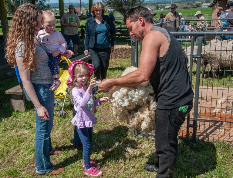 With no rain in sight, the sheep pen was moved out from under the balcony. John Sanchez, our veteran sheep shearer, won the respect of the audience with his masterful handling of a sheep: selection, quick flip and then running the electric shears first on its belly and rear quarters and then working up the front and sides so that the full coat collected in a pile. John answered the many questions from the crowd: No, the sheep wasn’t in pain or discomfort; as long as he kept the sheep’s feet off the ground it couldn’t resist him; generally, sheep are shorn once a year, in the spring; the sheep appears comfortable without its fleece; when he does commercial shearing he shears about 160 sheep in an hour. At this event John sheared our three sheep on a schedule of one an hour, allowing plenty of time for Q&A.