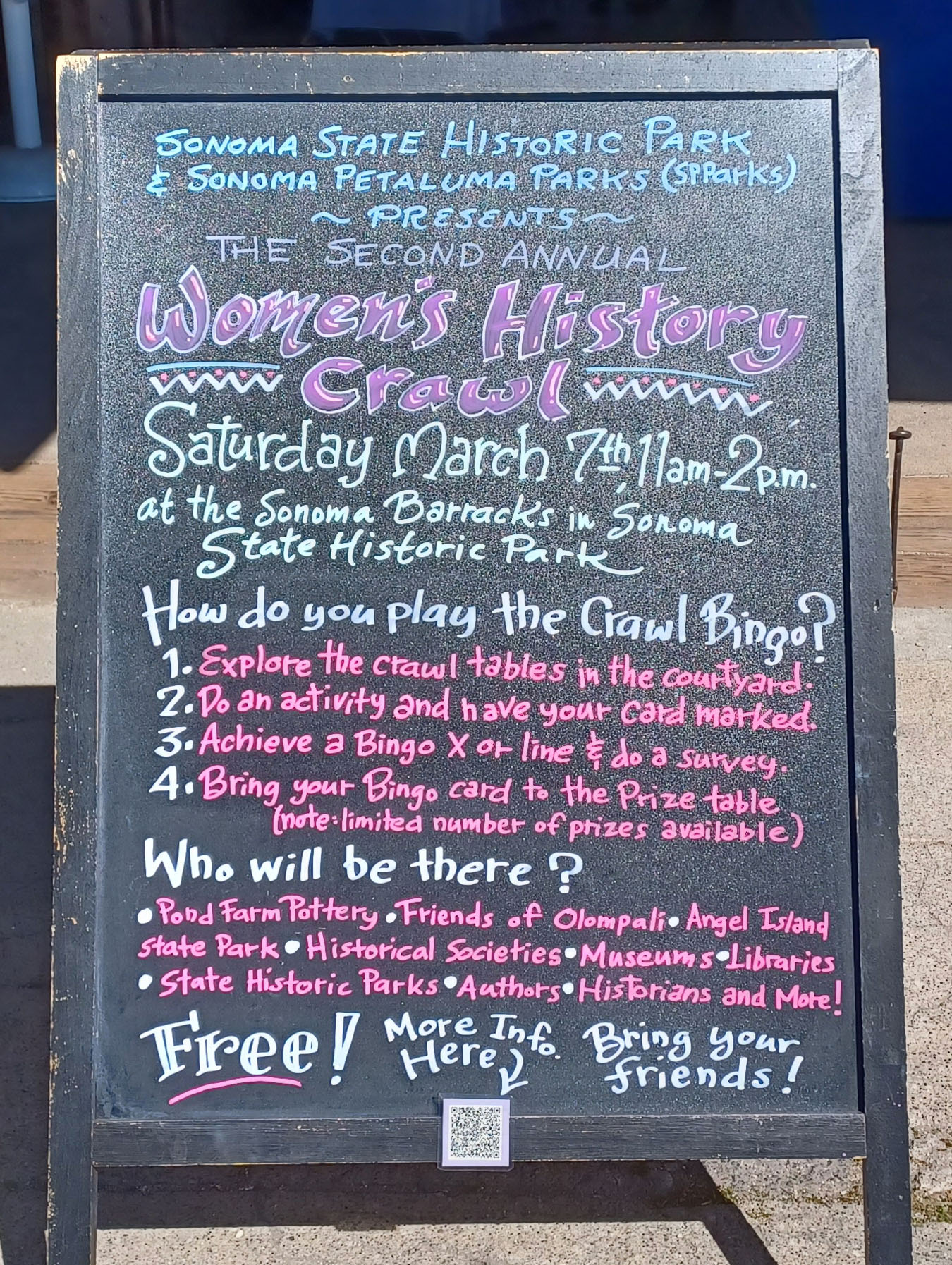 The second annual Women’s History Crawl returned to the Barracks at Sonoma State Historic Park on a sizzling March Saturday, offering a free, interactive afternoon devoted to the stories of women who shaped California’s past. Hundreds of participants and visitors from near and far explored with their Bingo cards and scored the many fabulous prizes. A great time was had by all.